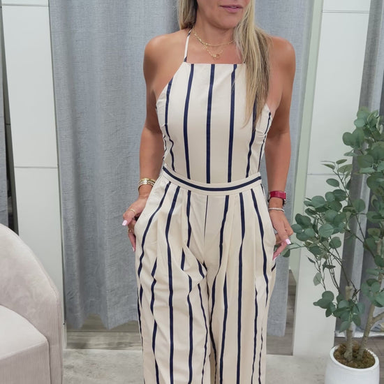 BEAUTIFUL JUMPSUIT IN BEIGE COLOR WITH BLUE STRIPES.