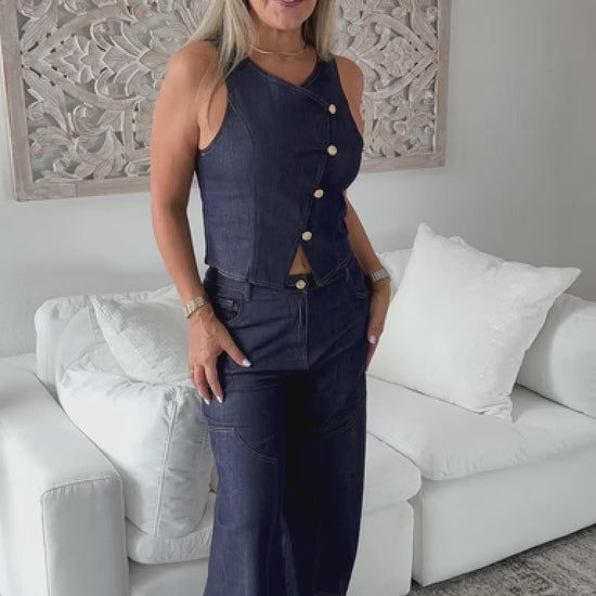 BEAUTIFUL SET PANT AND VEST COMBINATION IN DARK DENIM .