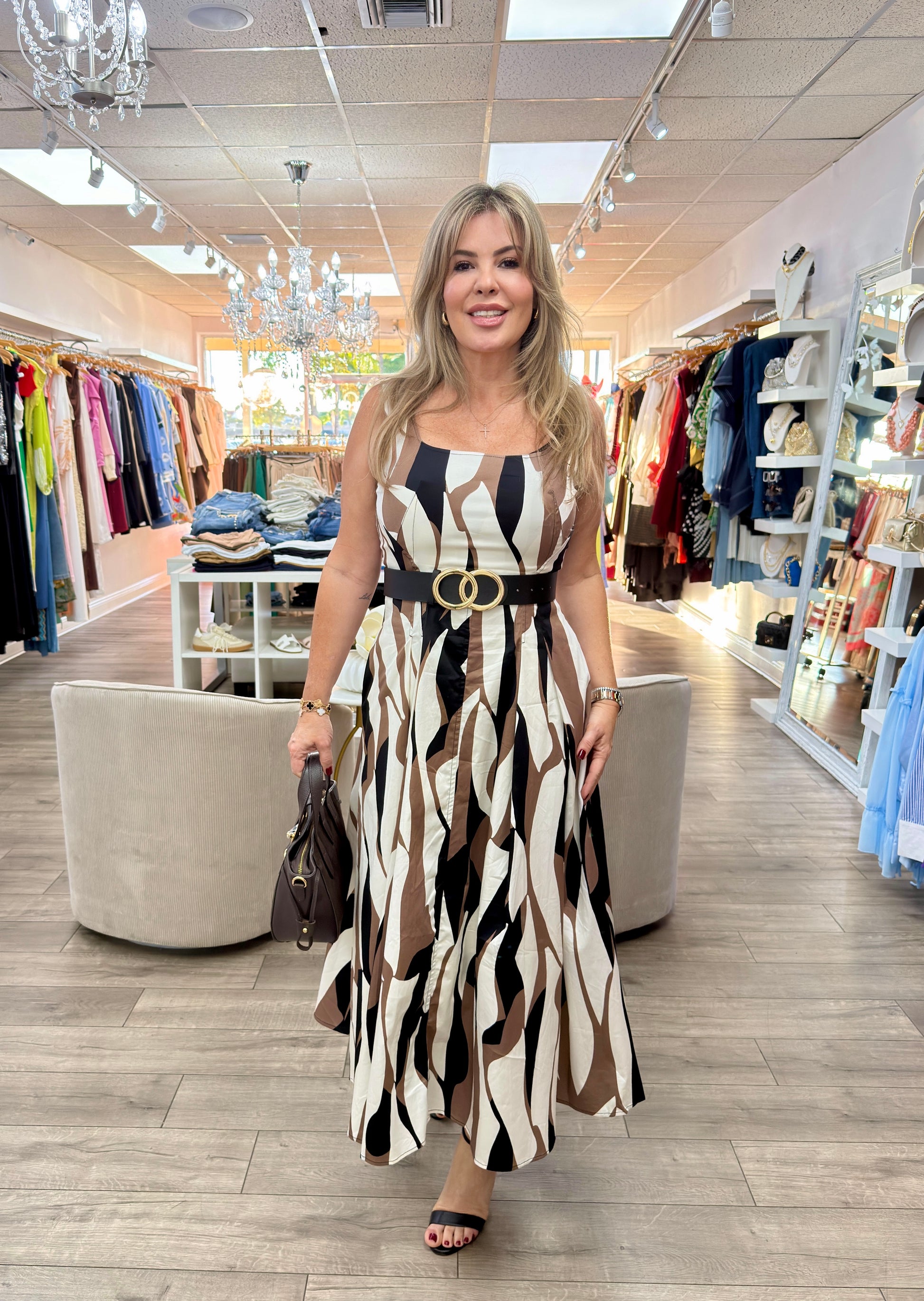 This maxi dress features a flattering belt that defines the waist for an elegant silhouette. Crafted for both comfort and style, it offers a versatile option suitable for various occasions, combining timeless colors with a modern cut.